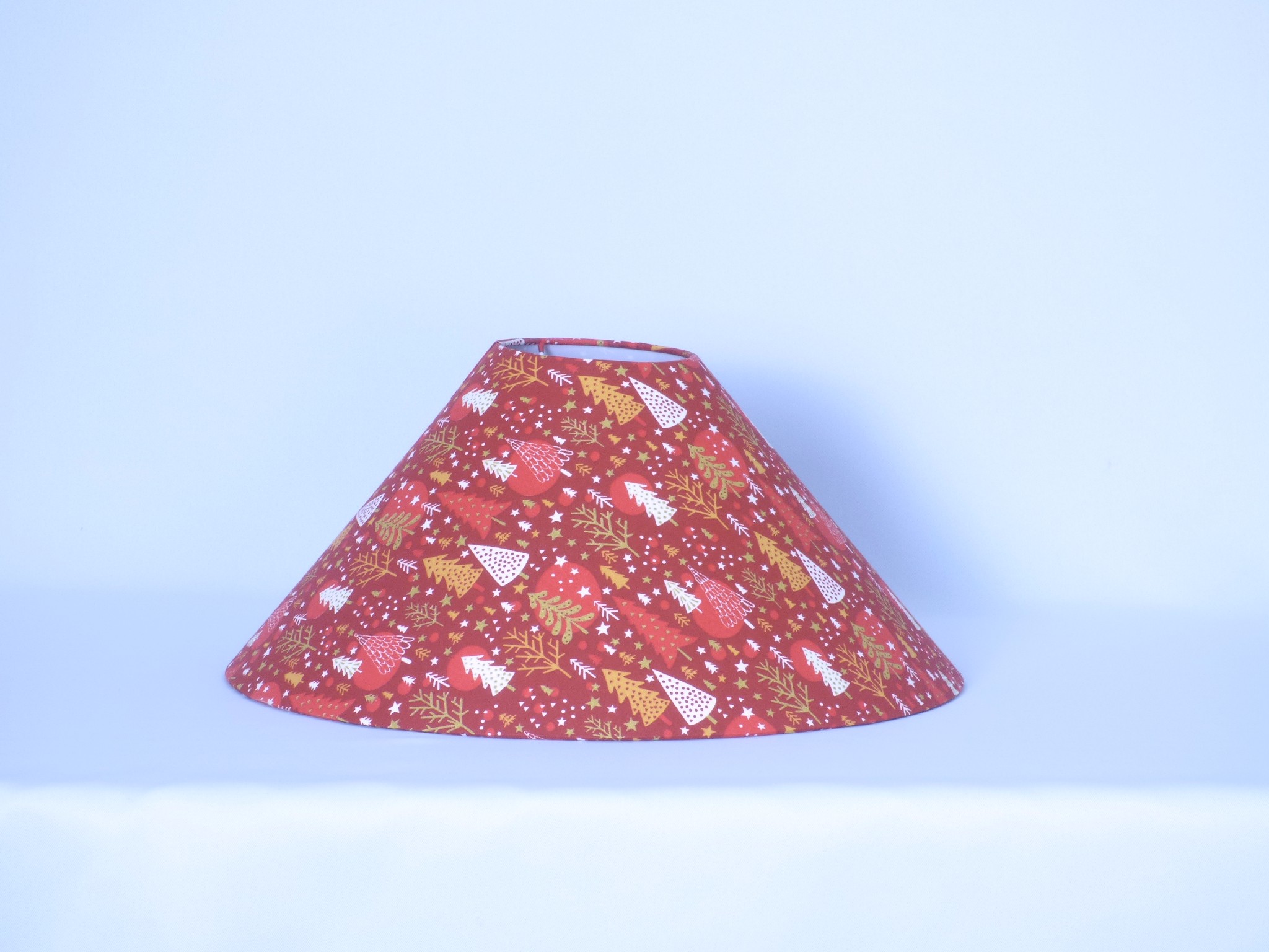 Décors de Noël personnalisé Sous l’éclat d’un fond rouge vibrant, des sapins s’élancent, témoins silencieux de l’hiver et de ses enchantements. Cet abat-jour, paré de motifs festifs, illumine votre foyer aux couleurs de Noël en cette saison magique.